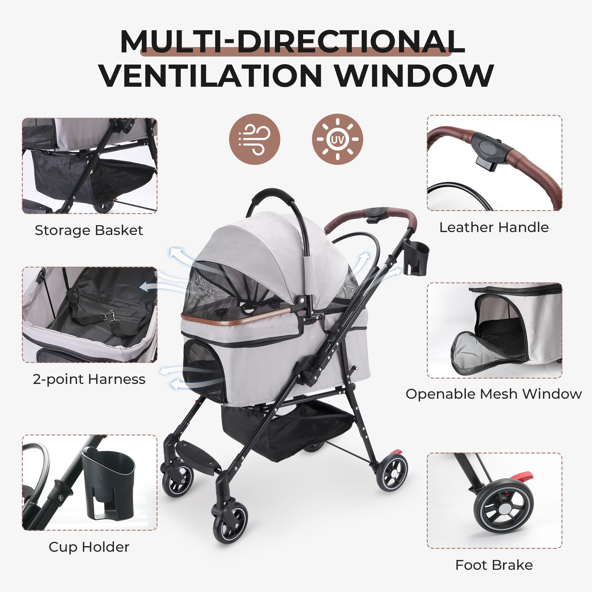 [Safety First, Always]Experience total peace of mind with 360° swivel wheels, full suspension system, and reliable rear-wheel brakes. Leash clips inside securely attach to your pet’s harness, keeping them safely seated throughout the ride.