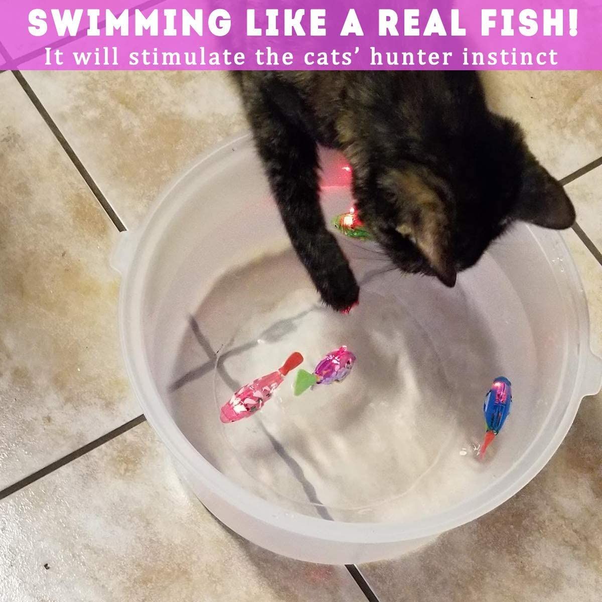 KEEPS YOUR CATS ENTERTAINED - The swimming fish twisted their tails; flashing red lights; and then swimming everywhere. Cats will immediately be attracted by these cat toy fish. The robot fish are quite sturdy and the random motion they make with the blinking led's was a enough to draw at your cats in.