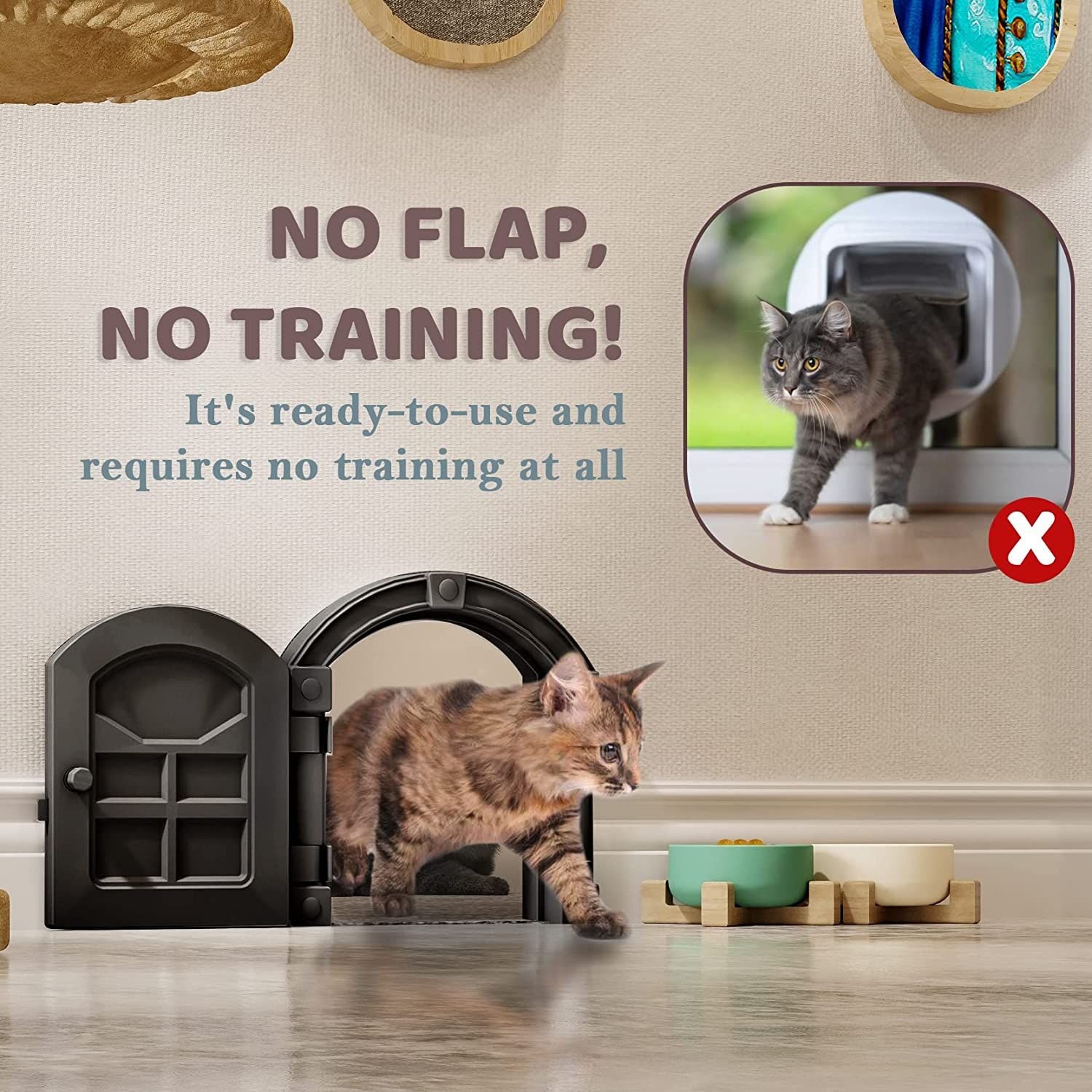 3.Our Interior Cat door can be automatically fixed when opened at 180 degrees, without the need to install other fixed accessories. And the cat doesn't need training to use it, and best of all, it won't hurt your cat the same way the flip cat door does, and it won't annoy you with that annoying flip noise.