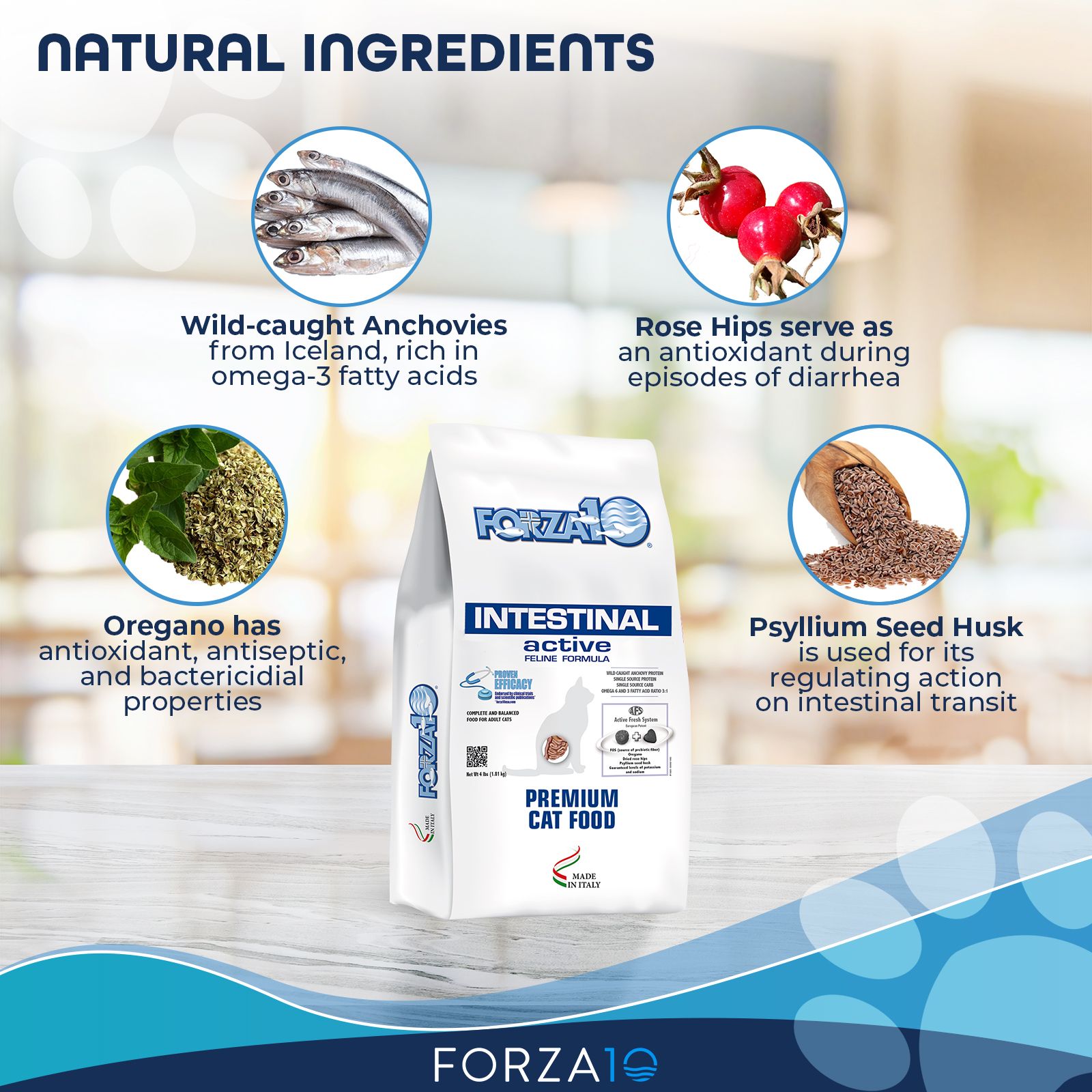 Ground rice, anchovy meal, hydrolyzed fish protein, fish oil (preserved with mixed tocopherols), chicken fat, hydrolyzed potato protein, brewer's yeast, dried kelp, dried beet pulp, minerals (calcium carbonate, dicalcium phosphate, zinc sulfate, iron sulfate, copper glycine complex, manganese oxide, sodium selenite, potassium iodide), dried yeast, fructooligosaccharide (FOS), DL-methionine, vitamins (vitamin A acetate, vitamin D3 supplement, vitamin E supplement, niacin supplement, vitamin B12 supplement, thiamine mononitrate, calcium pantothenate, riboflavin supplement, pyridoxine hydrochloride, biotin, folic acid), choline chloride, taurine, dried rose hips, psyllium seed husk, oregano, yucca schidigera extract, Enterococcus faecium product, rosemary extract.