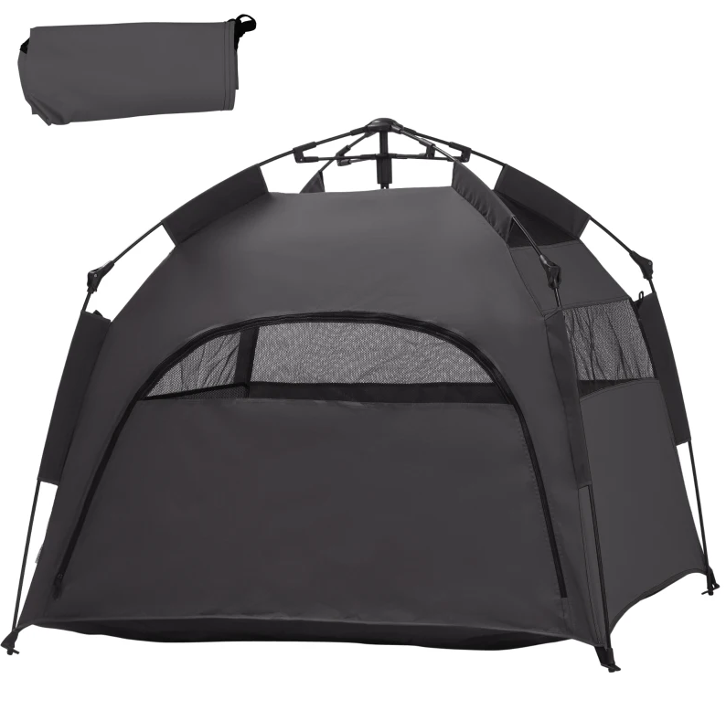 Features: - Offers sunburn protection and a private space for pets - Sturdy construction with enough ventilation - Fits extra large and large dogs less than 29.5" in length and less than 88 lbs. in weight - Suitable for home, backyard, camping, beach, and more - Includes ground pegs for anchoring outdoors - Easy to assemble and take down - Features a carrying bag and is lightweight for portability Specification: - Color: Dark Gray - Materials: Oxford Fabric (100% Polyester), Fiberglass - Overall Dimensions: 47.25" L x 47.25" W x 41.75" H - Interior Dimensions: 43.25" L x 43.25" W x 33.5" H - Folded Dimensions: 11.75" L x 11.75" W x 19.75" H - Door Size: 40.5" W x 23.25" H - Window Size: 29.5" W x 6.25" H (Door). 35.5" W x 7.75" H (Side). 26" W x 13.75" H (Top) - Sunshade Top Size: 33.5" L x 33.5" W Package Includes: - 1 x Pet Tent - 1 x Carrying Bag - 4 x Ground Peg - 1 x Manual