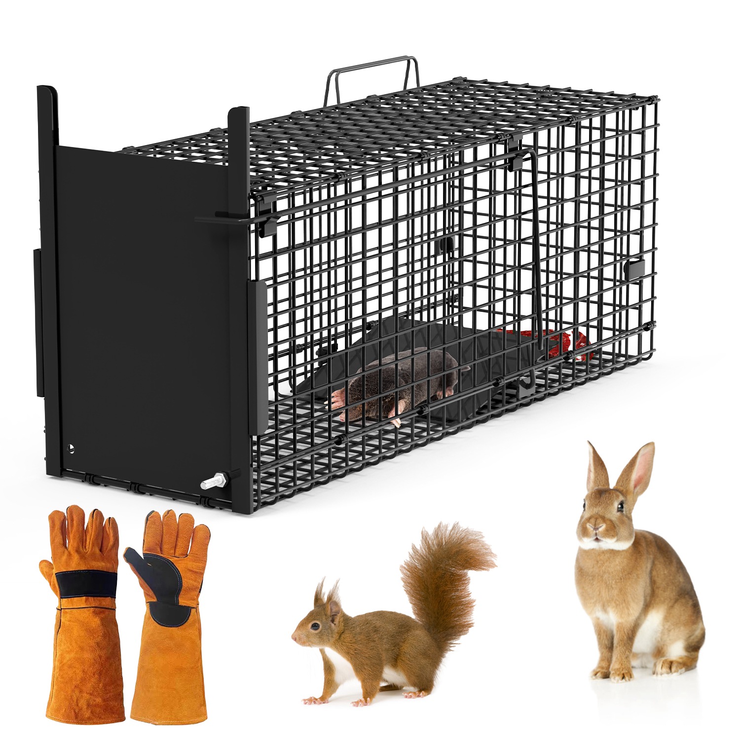 Crafted from 0.1in thickened metal wires, this heavy duty humane animal trap cage is durable and sturdy, able to withstand harsh weather. It features galvanized technology and powder coating for added rust and corrosion protection. The sensitive trigger instantly activates when the pedal is touched slightly, ensuring no chance for animals to escape. With a folding height of about 3.15inches, it can be easily collapsed for storage and transportation, suitable for indoor and outdoor use. The smooth internal edges prevent injuries to animals and humans, while an upgraded handle with a guard plate prevents scratches. Our animal spring trap will be your trusted hunting companion in the wild and an effective pest control solution in your garden.