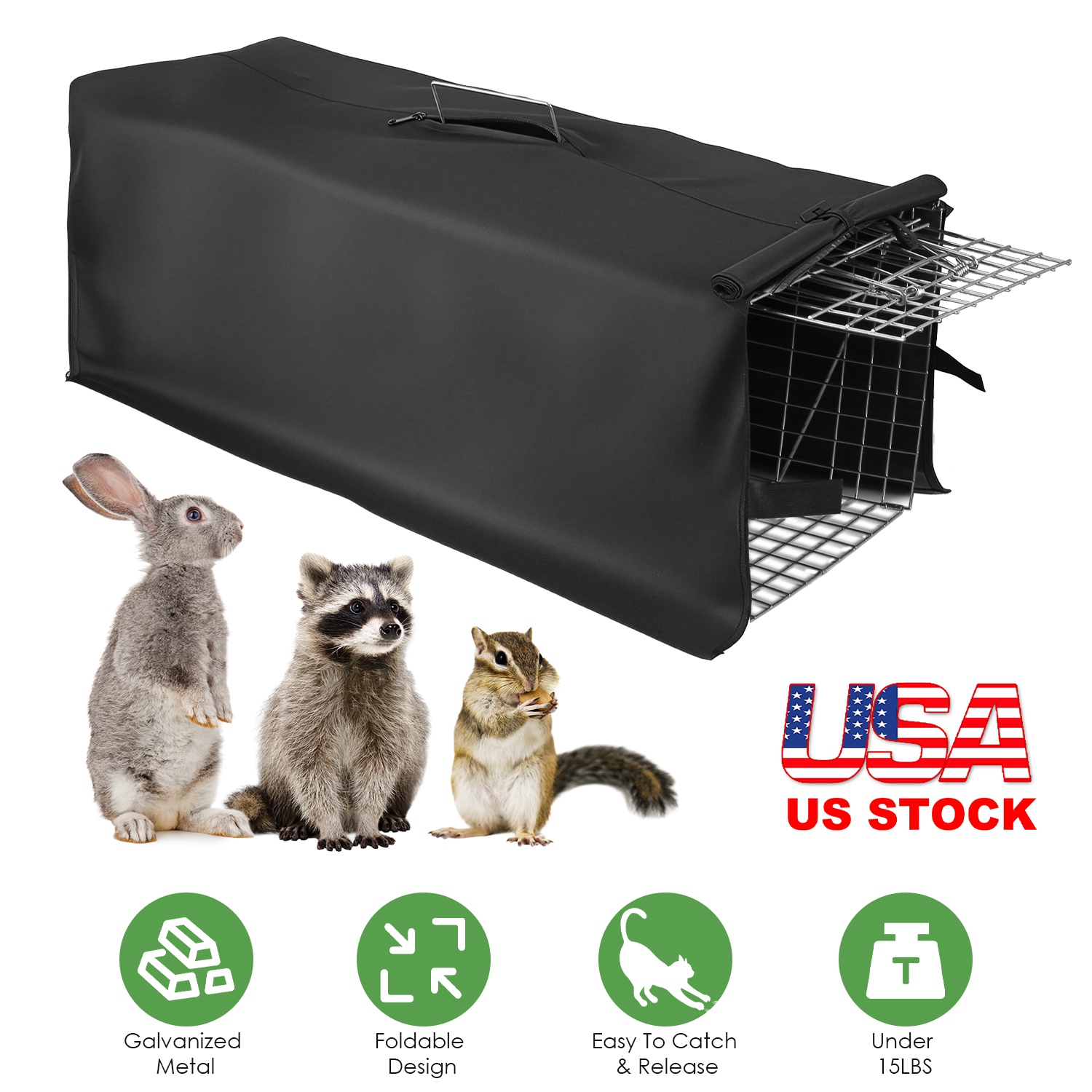 The 31” animal trap cage is a humane live trap for small animals under 15lbs, including raccoons, armadillos, cats, foxes, rabbits, and squirrels. Solid construction with galvanized coating resists bites, impacts, and corrosion, ensuring long-lasting use. The sensitive trigger and spring-loaded door enable easy capture with a light pedal touch, while the foldable design allows quick setup and space-saving storage. A portable handle with guard ensures safe transportation. Ideal for both indoor and outdoor use.